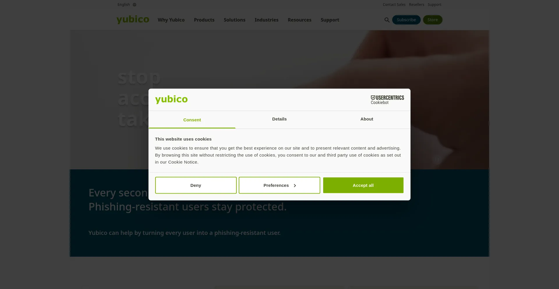 该网站实现符合GDPR或CCPA等隐私法规的cookie同意机制。这表明 yubico.com 遵守数据保护标准并为用户提供对个人数据收集实践的控制。
