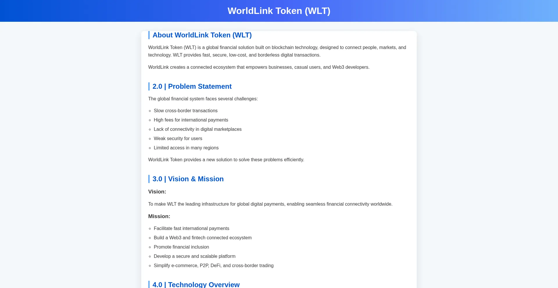 WorldLink Token (WLT) is a global financial solution built on blockchain technology, designed to connect people, markets, and technology.