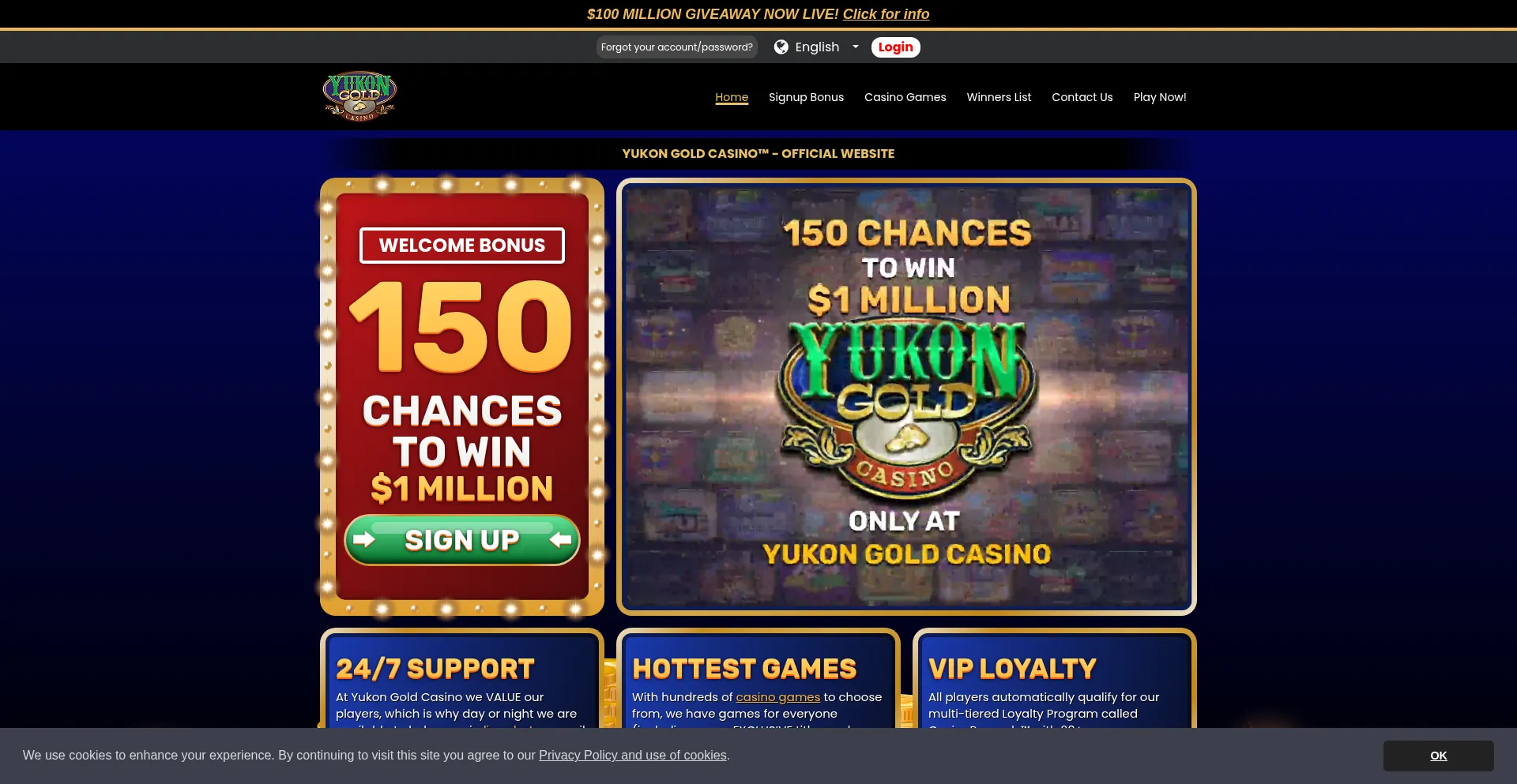 Yukon Gold Casino offers 150 Chances to Win $1 Million! Claim this amazing welcome bonus here. Yukon Gold Casino Official Website.