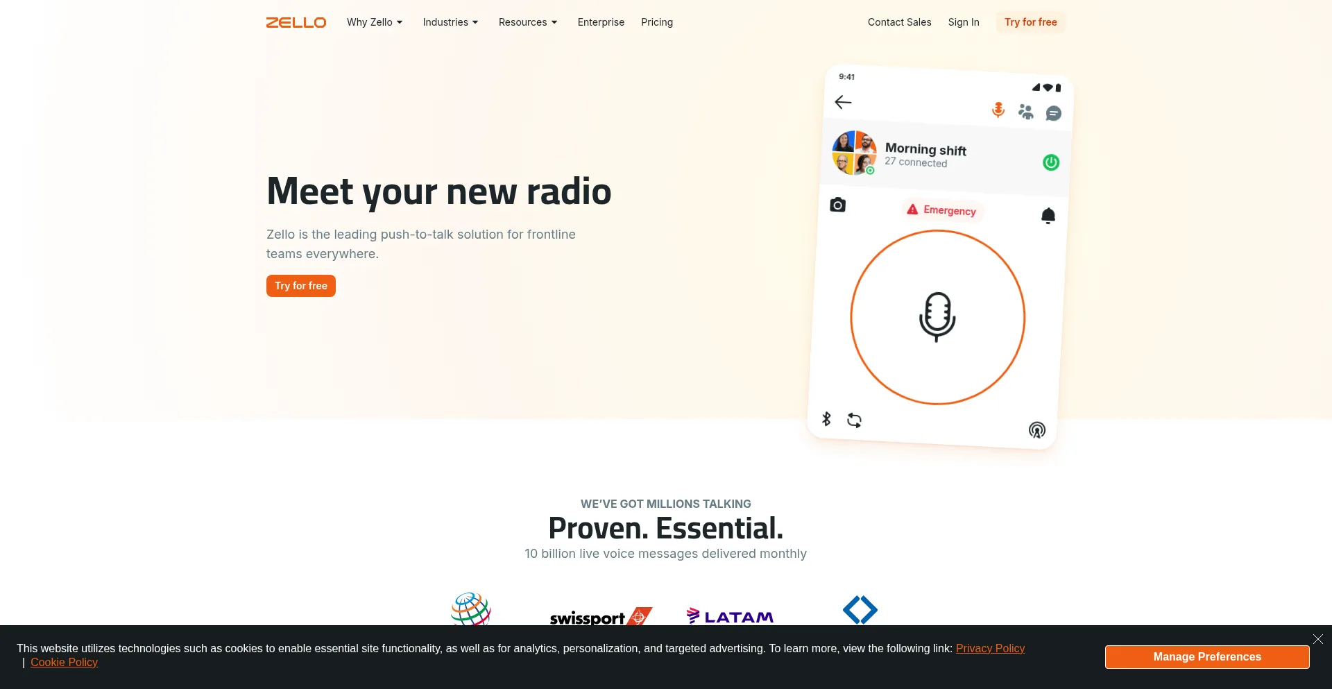 该网站实现符合GDPR或CCPA等隐私法规的cookie同意机制。这表明 zello.com 遵守数据保护标准并为用户提供对个人数据收集实践的控制。