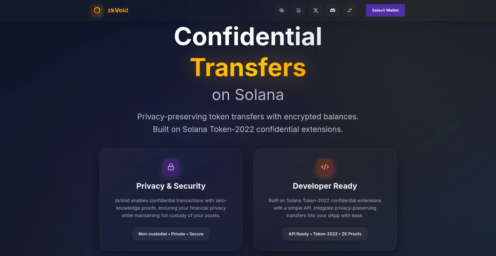 Experience true financial privacy with zkVoid - the most advanced confidential transfer protocol on Solana. Built on Token-2022 with zero-knowledge proofs.