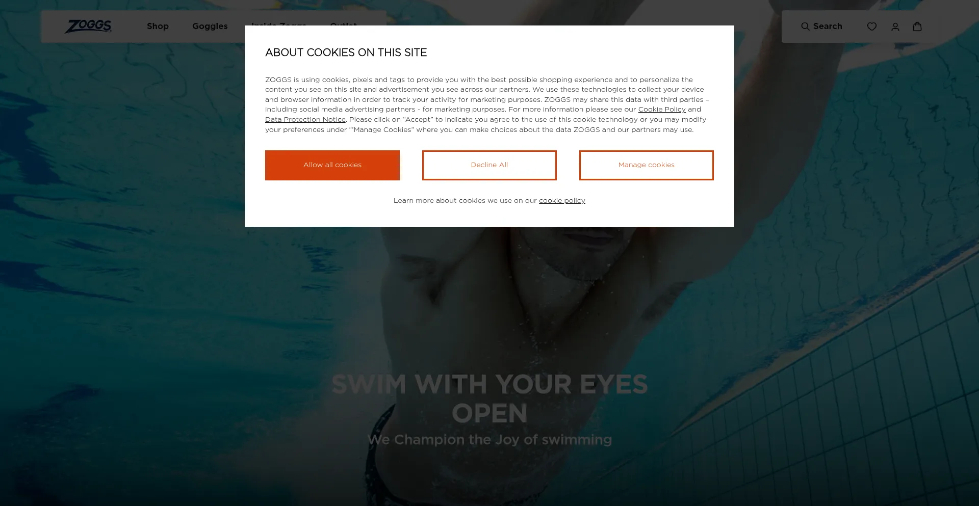 该网站实现符合GDPR或CCPA等隐私法规的cookie同意机制。这表明 zoggs.com 遵守数据保护标准并为用户提供对个人数据收集实践的控制。