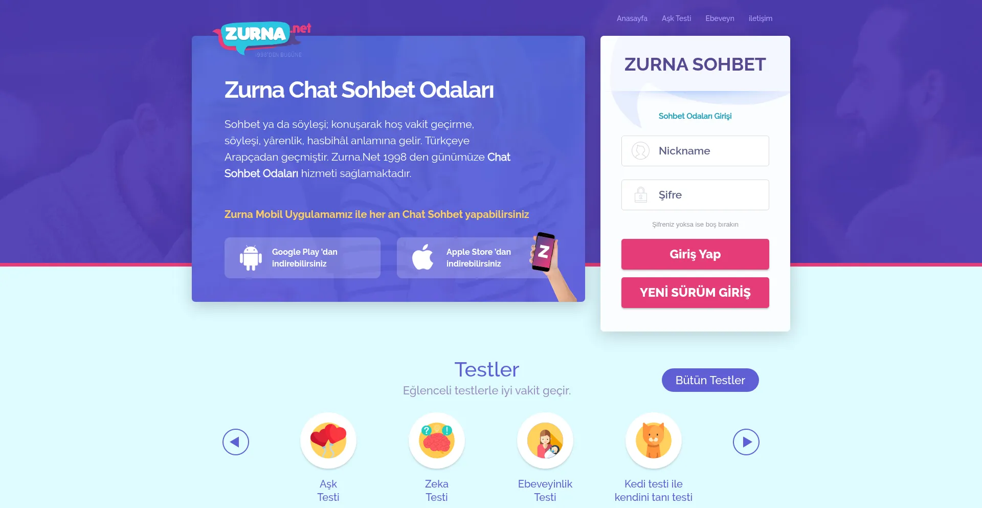 Zurna chat sohbet odaları 1998'den bu yana ziyaretçilerine en kaliteli ve bedava sohbet odaları hizmetini sunan nezih mobil sohbet sitesidir.