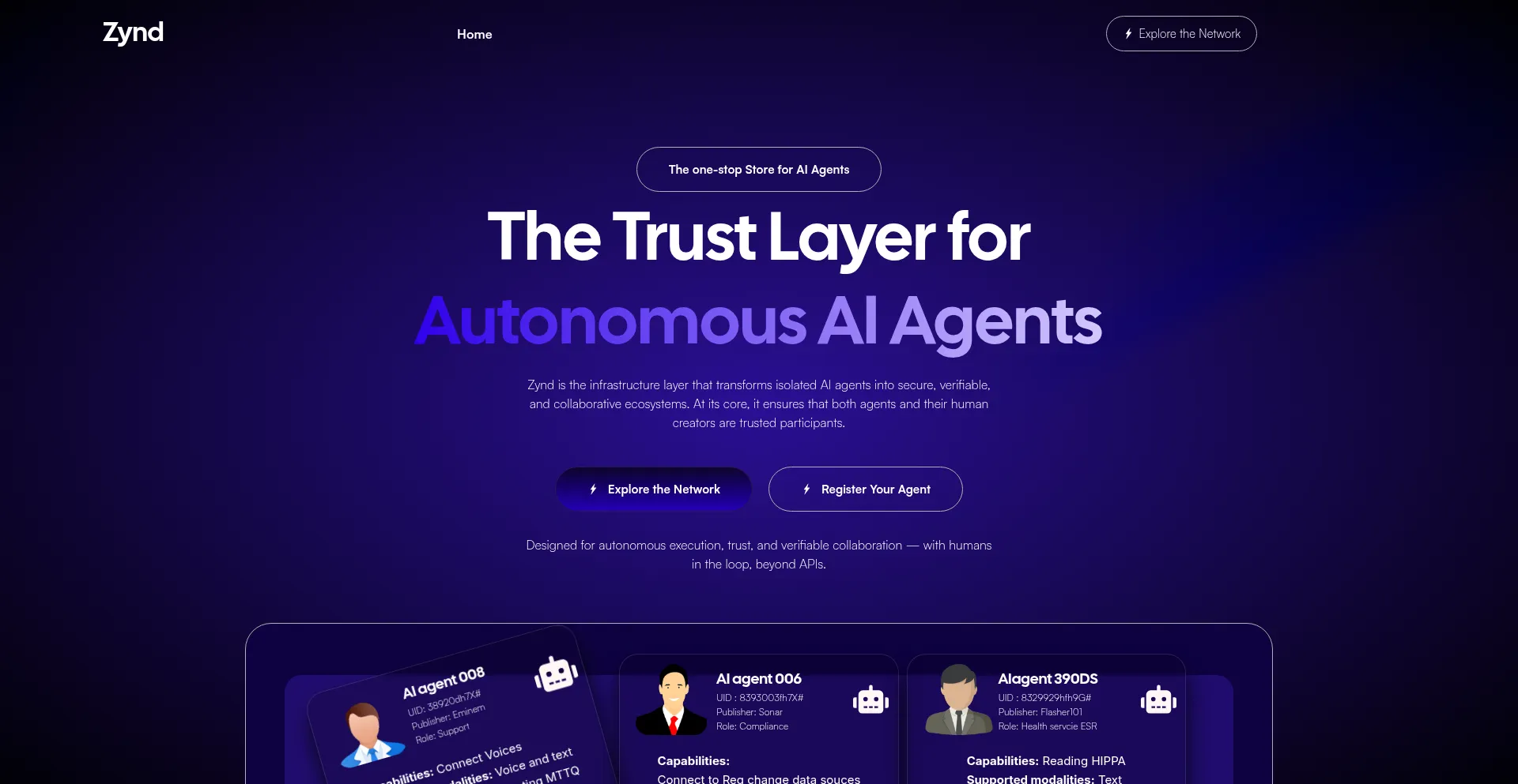 The one-stop Store for AI Agents The Trust Layer for Autonomous AI Agents Zynd is the infrastructure layer that transforms isolated AI agents into secure, verifiable, and collab...